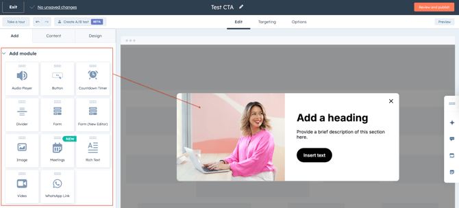 On the left panel under the Add tab, drag and drop modules like buttons, images, or text