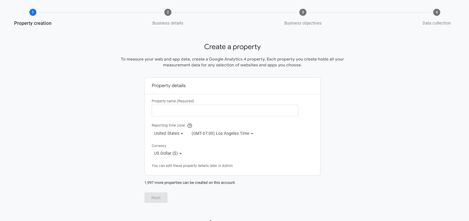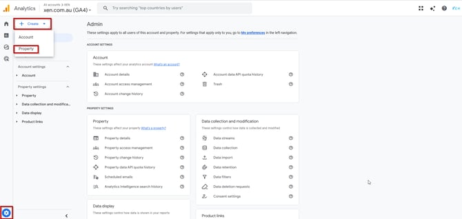 - Click the Settings cog and then click Create at the top left, then select Property from the dropdown options